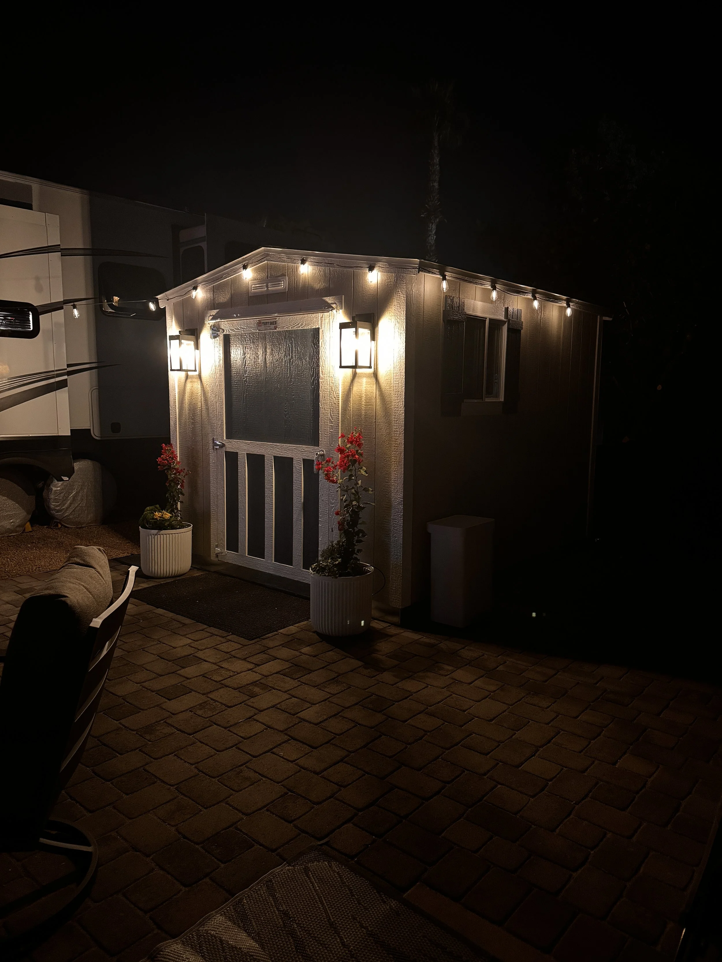 The last 10 days have flown by and I fall into bed each night exhausted and sore, but in a good way. I’ve been working hard to get my outside space set up and have been chipping away on a very long list which now only has one thing left (to wash the awnings) which should get done tomorrow. What started as a bare gravel spot is now my little oasis in the desert with pavers, potted local plants, a fountain, furniture and a storage shed. I need to get some better photos but here’s a quick view of the sitting area and my shed.