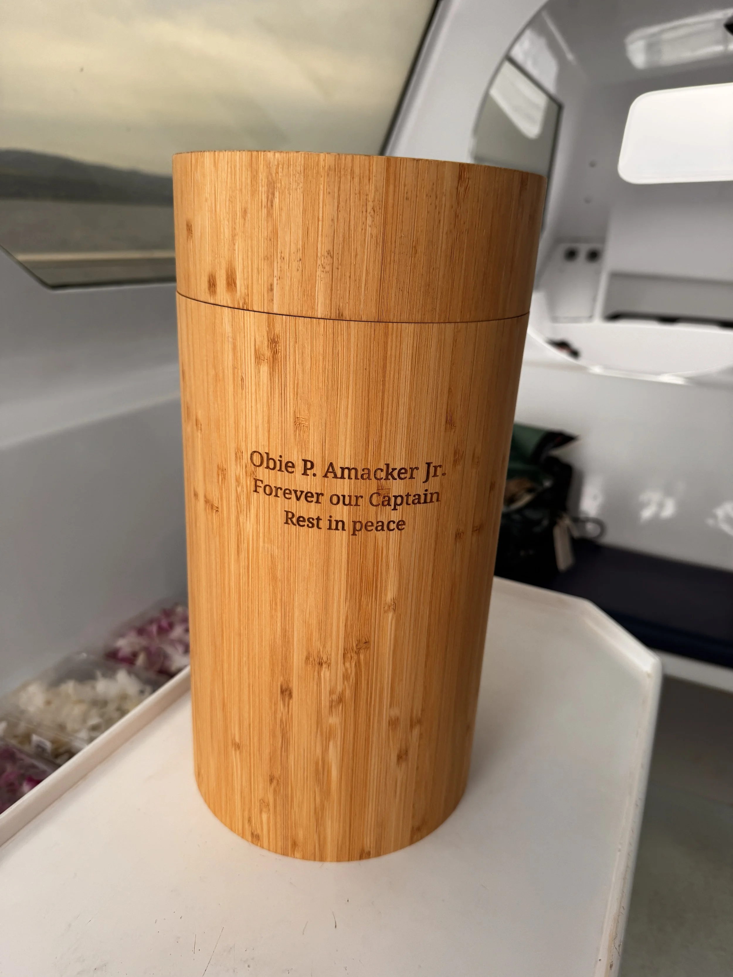 The captain helping me stay on the boat as I placed the urn with Obie’s ashes into the ocean.