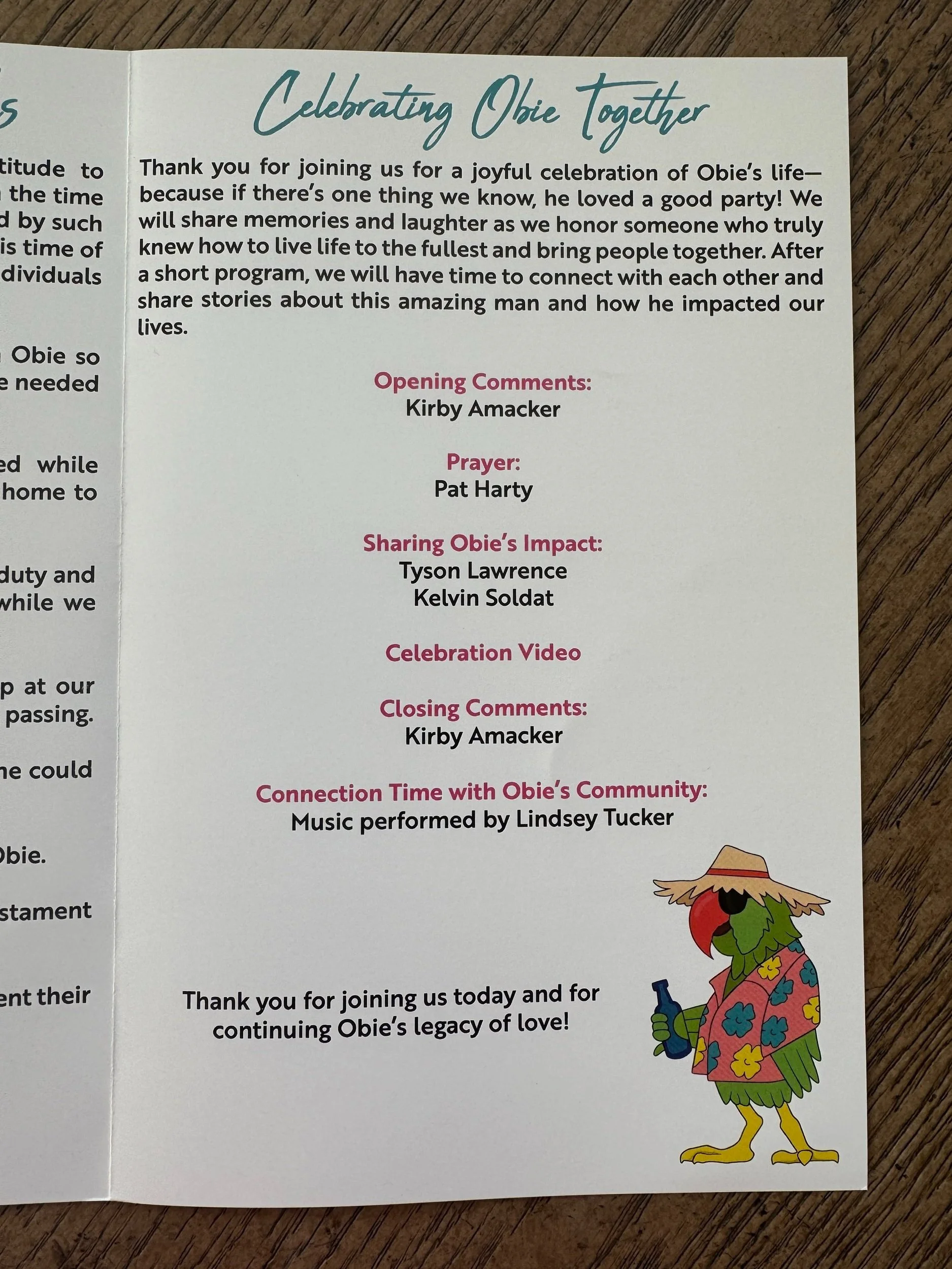 As Obie would say, “let’s get this show on the road!” We are going to hear from a few folks who will share how Obie impacted their lives. We’re going to share a video that reflects his life. We’re going to hear the talented Linsey Tucker play for us. And most importantly, we’re going to have time to connect. There will be tears, but hopefully there is also laughter.