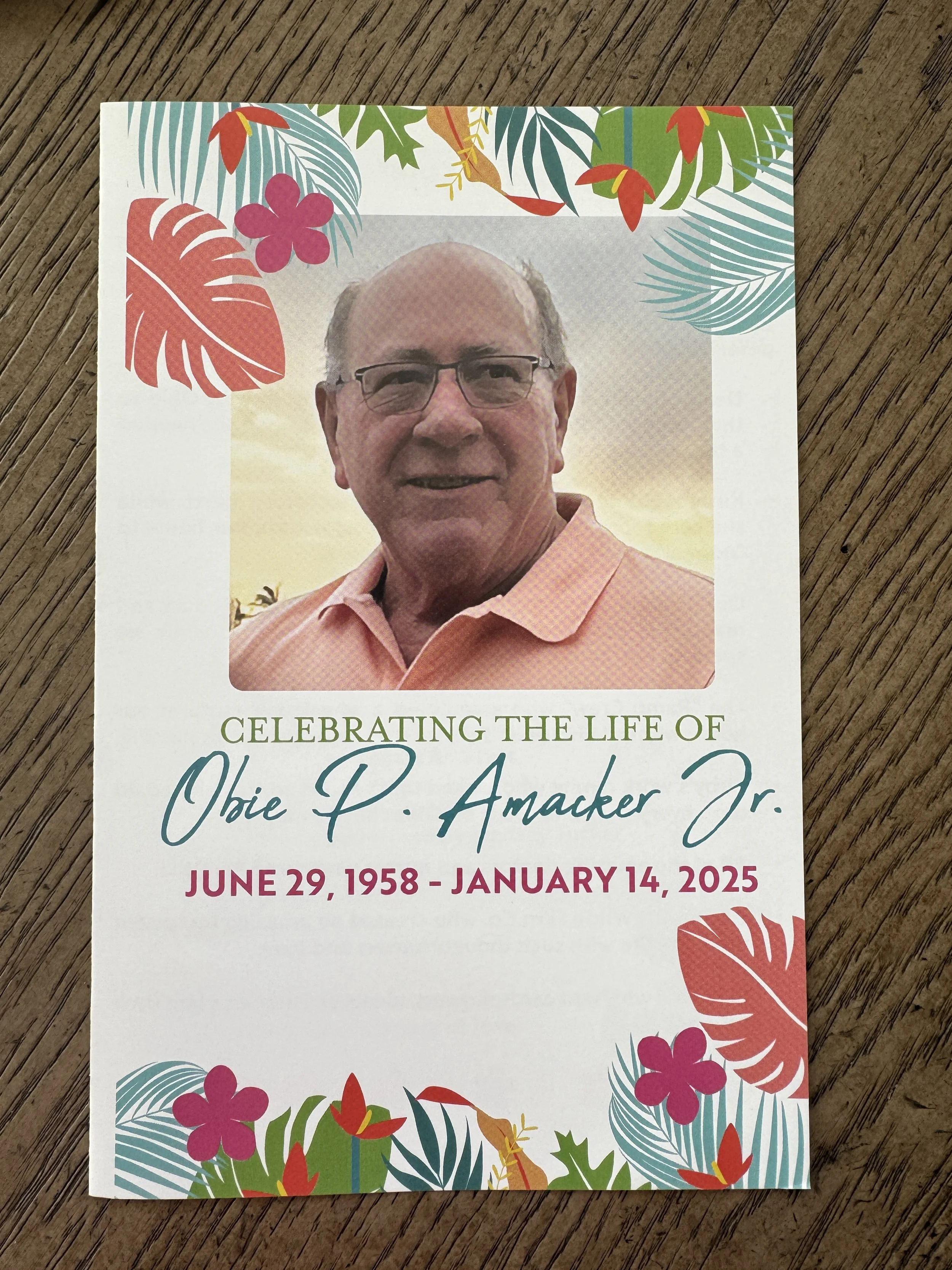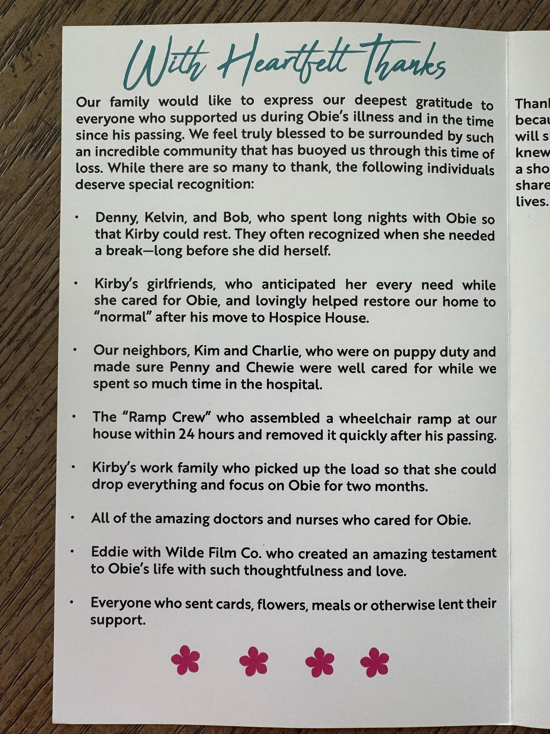I have also created a blog to share my thoughts and experiences of navigating life during this time of grief and loss. The video from today will be posted this afternoon if you’d like to watch it again. The link is listed on the back of the program as well. Obie also created his own celebration of life playlist last summer before we knew what was on the horizon. The link to the Spotify playlist which is also linked on my site. He was a planner and many of us have heard him utter “failing to plan is planning to fail”.
